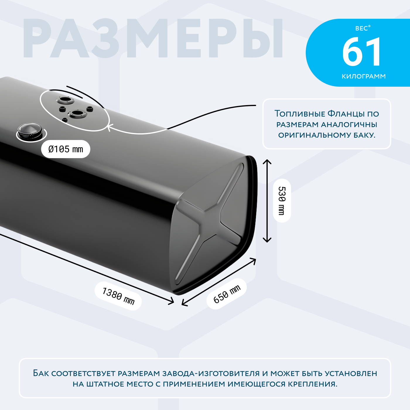 Бак полностью соответствует габаритам оригинального бака, поэтому его можно установить при помощи имеющихся кронштейнов без доработок. Все технологические отверстия соответствуют оригинальному баку, с которого можно переставить датчик уровня топлива и топливозаборник. Новые датчик и заборник Вы можете приобрести отдельно. Заливная горловина соответствует оригинальной по диаметру, и расположению. Стальная полуоборотная заглушка с клапаном без замка, а также сливная пробка (1/4" коническая, под шестигранник) включены в стоимость бака без комплектующих.